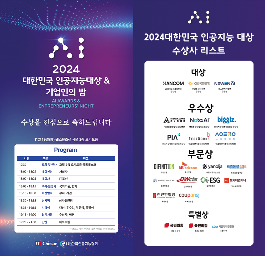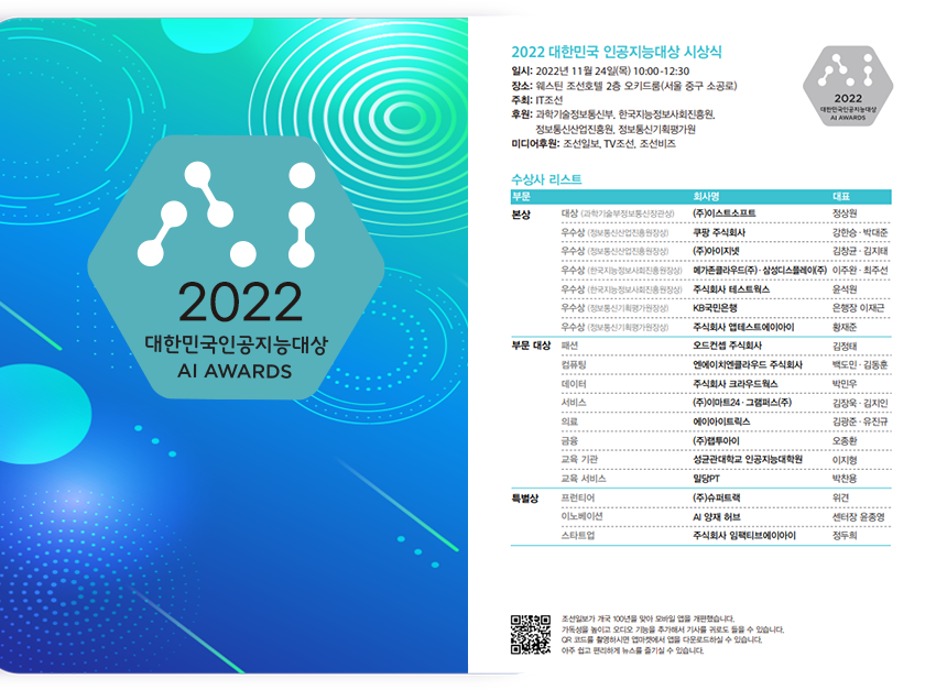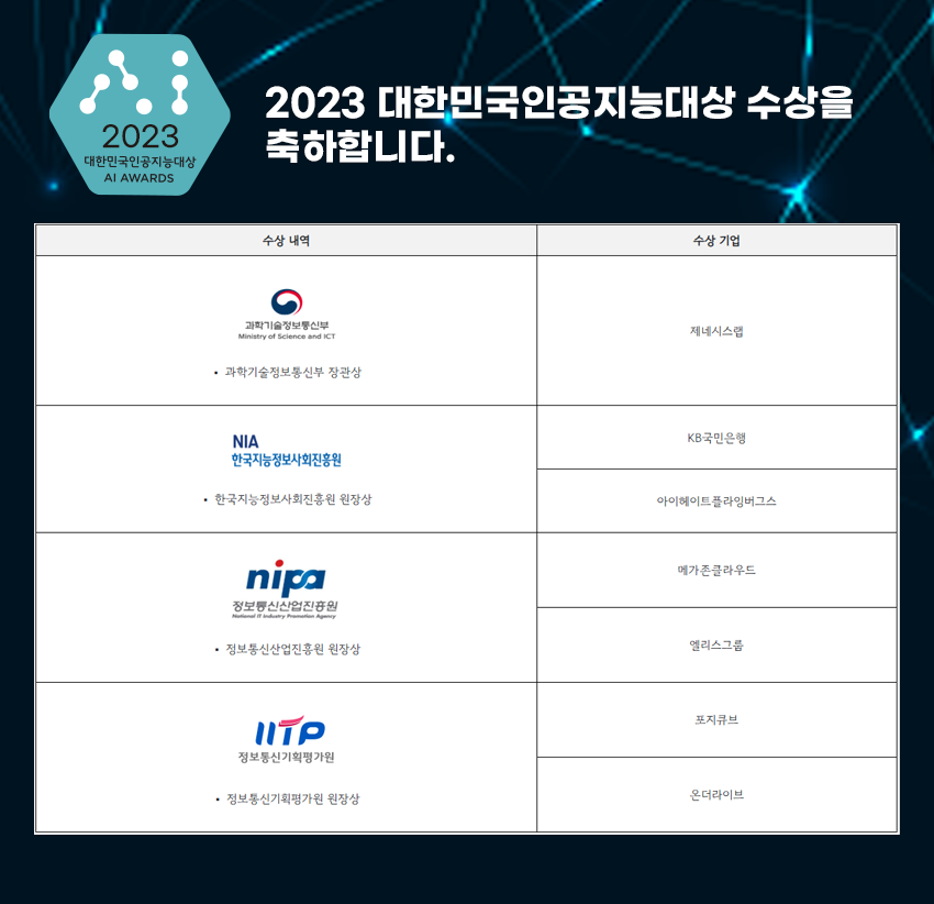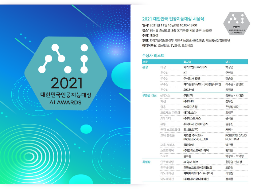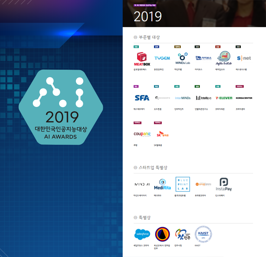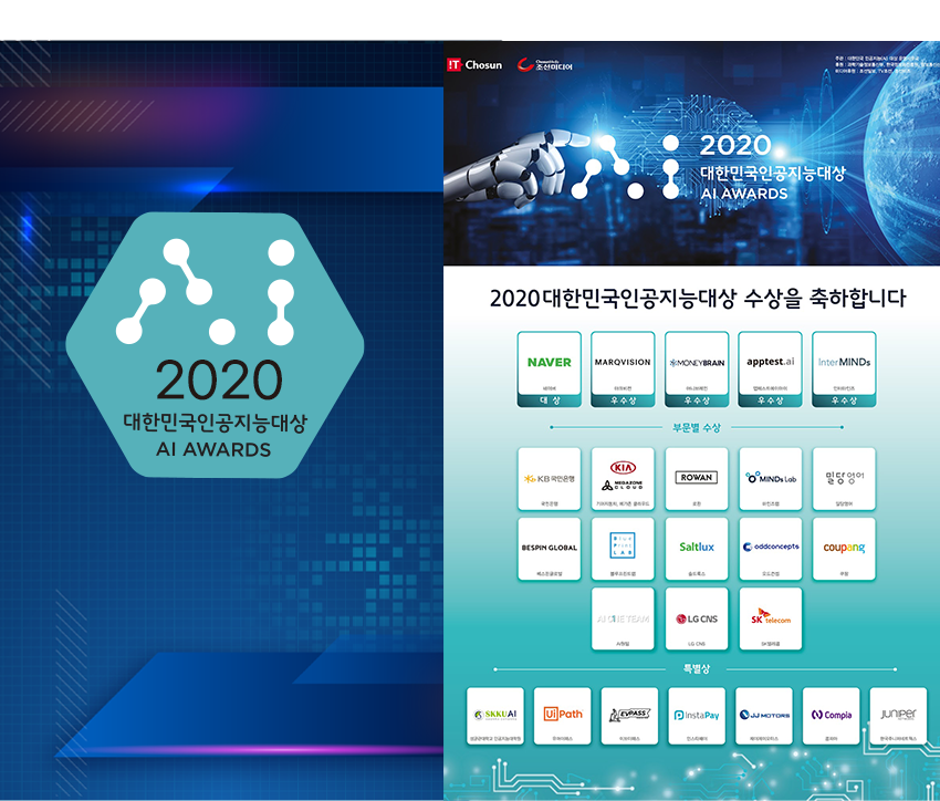 AWARDS -대한민국인공지능대상 IT조선이 주최하고 과학기술통신부, 산업통상자원부, 중소벤처기업부, 정보통신기획평가원(IITP), 정보통신산업진흥원(NIPA), 한국지능정보사회진흥원(NIA)이 후원한 대한민국인공지능대상을 2019년부터 개최하며 AI 분야에서 성과를 나타낸 단체, 기업에게 상을 수여합니다. 2024년 2023년 2022년 2021년 2020년 2019년