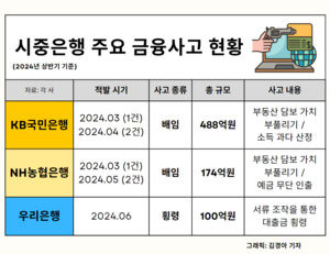 올 들어서도 KB국민은행부터 NH농협은행, 우리은행까지 대형 시중은행에서 배임·횡령 등 금융사고가 끊이지 않고 있다. 지난해 BNK경남은행에서 발생한 3000억원 규모의 횡령 사고가 은행권에 경각심을 불러일으킨 듯했지만, 사고를 막을 수는 없었다.시중은행의 ‘유명무실’ 내부통제 시스템이 도마 위에 오른 가운데, 하반기 도입되는 ‘책무구조도’를 통해 최고경영자(CEO)에게까지 책임을 물을 수 있는지 관심이 모인다.2일 금융권에 따르면 올해 상반기에만 주요 시중은행(KB국민·신한·하나·우리·NH농협은행)에서 총 11건의 금융사고가 발생