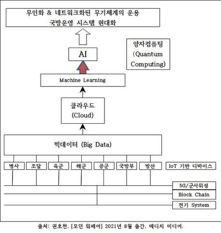 ICT는 현재 거의 모든 산업영역에서 가장 중요한 역할을 수행한다. 군사 분야도 예외가 아니다. 많은 전문가는 그 중요도가 미래 전쟁의 판도를 바꾸는 핵심 촉매제 역할을 할 것이라고 예상한다. 군사 분야에 적용된 ICT의 핵심 기술 연결구조를 필자가 정리한 표(아래)를 보면 매우 쉽게 그 연결성을 확인할 수 있다.