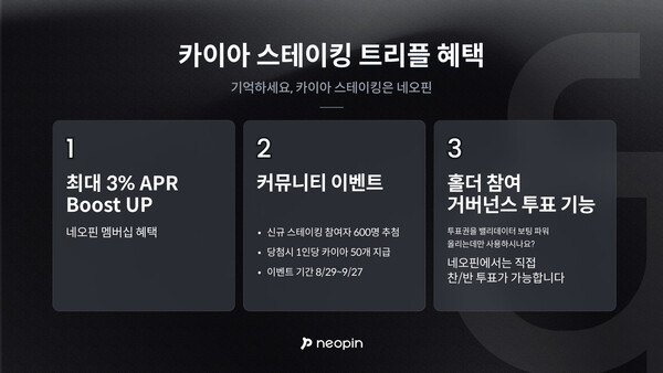 APR 부스트는 네오핀에서 카이아를 스테이킹(Staking, 가상자산 예치)하면 멤버십 등급에 따라 1.5~3%까지 이자를 받을 수 있다. 커뮤니티 이벤트는 오는 29일부터 내달 27일까지 약 한 달 동안 카이아를 신규 스테이킹하는 이용자들 대상으로 총 600명을 추첨해 1인당 50개의 카이아를 제공할 예정이다.