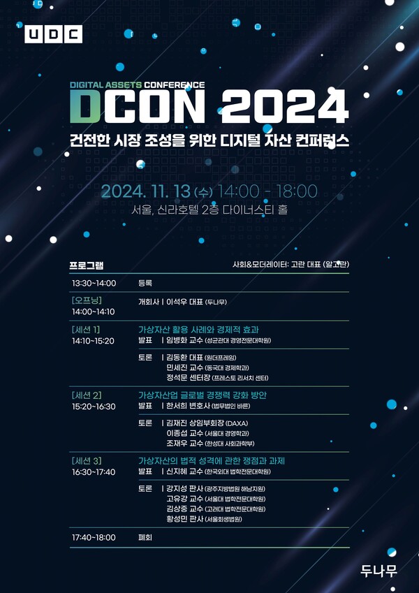 올해 2회째를 맞은 D-CON은 가상자산을 연구하는 학계 및 산업계 전문가들이 최신 연구 성과를 공유하며, 산업의 건전한 발전을 모색하는 학술 행사다. 올해 행사는 11월 14일 열리는 '업비트 D 컨퍼런스(UDC)'의 사전 프로그램으로 운영된다.