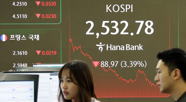 28일 코스피는 전날보다 88.97포인트(3.39%) 하락한 2532.78에 거래를 마감했다. 코스닥 역시 3% 넘게 하락한 743.96이다. 코스피는 지난 10일 기록한 2521.27 이후 14거래일 만에 최저점이다.