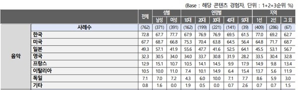 중국에서 가장 인기 있는 해외 음악콘텐츠가 K팝이라는 점도 긍정적이다. 한국국제문화교류진흥원의 ‘2024 해외한류실태조사’ 결과 해외 음악 콘텐츠 경험자의 72.8%는 K팝을 소비했다. 이는 1순위부터 3순위까지 선택을 모두 종합한 결과다. K팝 다음으로는 미국 67.7%, 일본 49.3% 순이다.