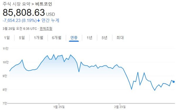 20일 가상자산 정보 플랫폼 코인마켓캡 기준 비트코인 가격은 8만5600달러(약 1억 2488만원) 대를 기록하고 있다. 비트코인은 전일 8만1100달러에서 반나절만에 최대 7.7% 오른 8만 7400달러를 기록하기도 했다.