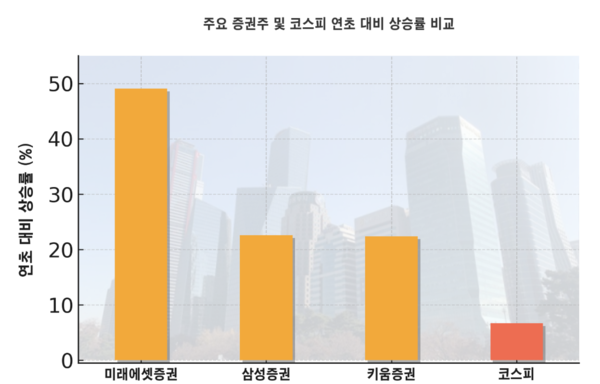 올 들어 국내 증권주가 연일 강세 흐름을 이어가고 있다. 미국발 관세 리스크에 따른 증시 불확실성 속에서 비교적 영향이 적은 ‘안전지대’ 업종으로 부각되면서다.