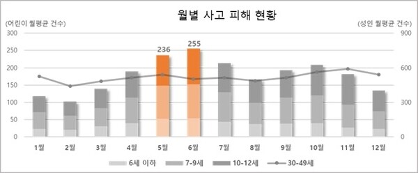 시기별로 보면 5~6월에 어린이 교통사고 피해가 많은 것으로 나타났다. 가장 많은 달은 5월 236건으로, 1~2월(111건) 대비 2.1배, 전체 월평균(178건) 대비 1.3배 수준이다. 3040대 사고 피해는 연간 고르게 분포되어 있는 반면, 어린이 사고는 봄철 집중도가 높았다.