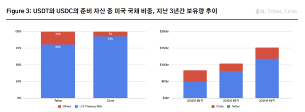 가장 널리 사용되는 스테이블코인은 USDT와 USDC다. 두 코인은 공통적으로 준비금 기반 구조를 갖고 있다. 사용자가 1개의 코인을 발행사에 반환하면, 1달러로 교환할 수 있는 구조다. USDT는 테더사가, USDC는 서클(Circle)과 코인베이스가 공동 발행한다. 각각 수십조원 규모의 미국 국채, 현금성 자산 등을 담보로 보유 중이다. 2025년 5월 기준 USDT는 1110억달러(약 152조원), USDC는 320억달러(약 44조원)의 시총을 기록 중이다.