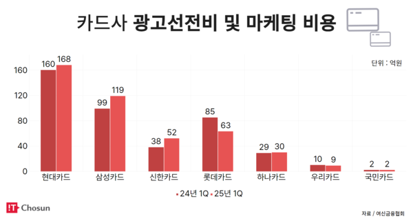 현대카드는 지난해에만 총 748억원을 광고선전비로 집행한 데 이어, 올해 1분기에도 168억원을 지출했다. 업계에서 가장 많은 금액이다. 현대카드의 지난해 신용판매액은 148조7455억원으로 전년 대비 11조원 이상 증가한 바 있다.