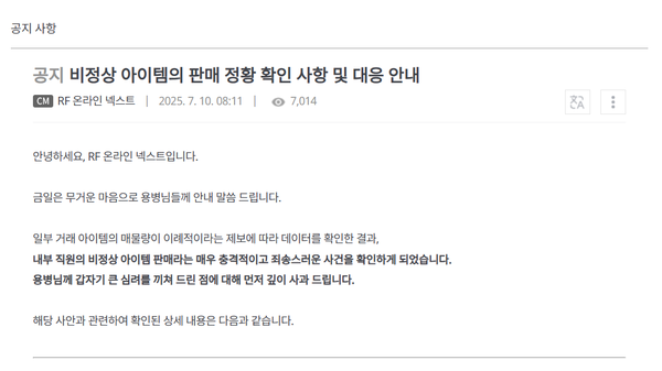 넷마블 자회사 넷마블엔투의 'RF 온라인 넥스트' 개발팀은 10일 “일부 거래 아이템 매물량이 이례적이라는 제보를 받고 데이터를 확인한 결과, 내부 직원이 비정상적으로 아이템을 판매한 사실을 확인했다”고 공지했다.